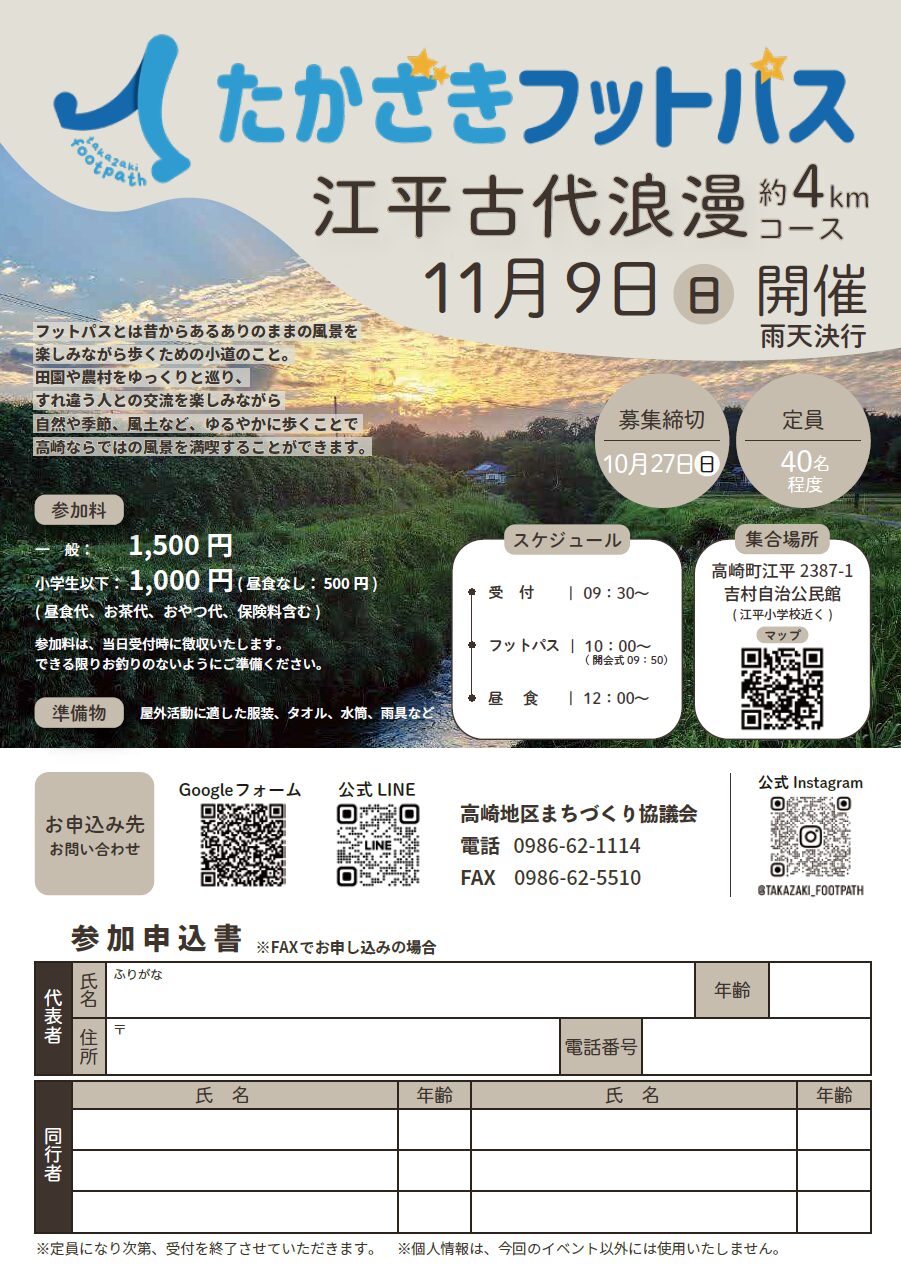 高崎フットパス「江平古代浪漫コース(約4km)」 2025年9月24日 最終更新日時 : 2025年9月24日 事務局 イベント詳細 日付: 2025年11月9日 9:30 AM タグ: フットパス部会 日時:11/9(日) 9:30受付/10:00スタート(開会式9:50)/12:00昼食 集合:吉村自治公民館(都城市高崎町江平2387-1・江平小学校近く) コース:江平古代浪漫(約4km)※雨天決行 定員/締切:40名程度/申込締切 10/27(日) 参加費:一般1,500円/小学生以下1,000円(昼食なし500円)※昼食・お茶・おやつ・保険料含む、当日受付で徴収 持ち物:屋外活動に適した服装、タオル、水筒、雨具など 申込・問合せ:高崎地区まちづくり協議会(Googleフォーム/公式LINE/FAXでも申込可) 応募フォーム 公式LINE