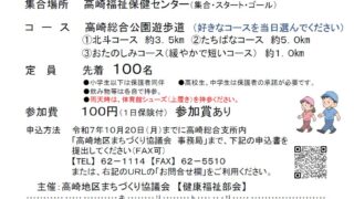日時:令和7年11月3日(月・祝)受付 9:30/開会 10:00 集合・スタート・ゴール:高崎福祉保健センター コース(当日選択): 北斗コース 約3.5km/2) たちばなコース 約5.0km/3) おたのしみコース […]